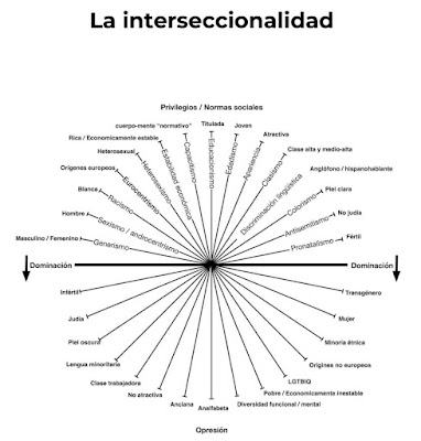 En cuanto al concepto de “interseccionalidad”[4], acuñado por la jurista afrodescendiente Kimberlee Crensahw, explica como la interrelación entre sexo, etnia, clase social y orientación sexual suelen afectar mayormente a quien sufre algún tipo de desigualdad. El “Mandala de la Interseccionalidad” diseñado por Patricia Hill Collins explica gráficamente como los privilegios y las opresiones se reproducen interseccionalmente en la sociedad.